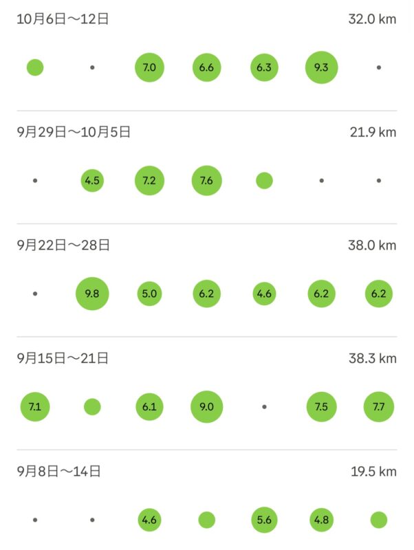 1週間くらい「進まなさ」を楽しんでいると、徐々に走ることが体に馴染んでくる感覚が。少しずつですが、手足の息が合ってきたように、走りやすくなっていきました。もちろんスピードは出ませんが、3-4週くらい経つと、キロ6ジョグが普通に感じるように回復しました!本当によかった!